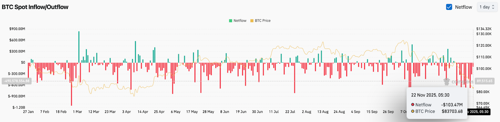 CoinGlass 数据显示,11 月 22 日又是一个资金大量流出的日子,约有 1.03 亿美元资金流出交易所。