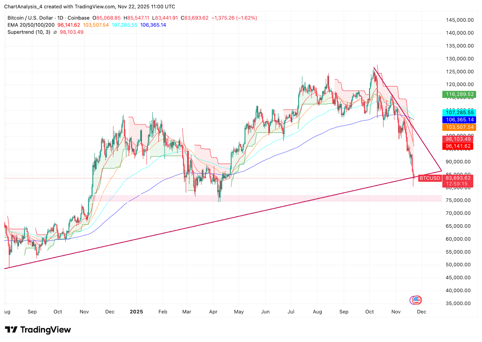 比特币目前处于长期趋势线上,下一步走势完全取决于买家在 83,000 美元至 81,000 美元价位的反应。