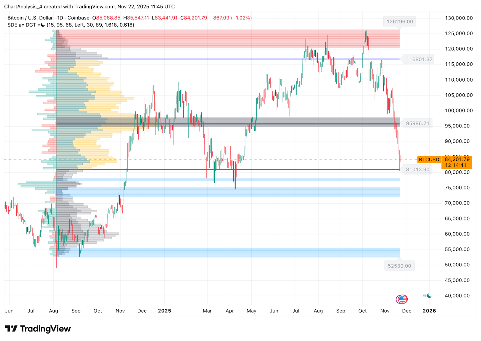 成交量分布图也印证了这一点。比特币跌破了95,900美元附近的高参与度区域,该区域曾是近八个月来的重要控制点。下一个重要的流动性层位于81,000美元附近,之后是76,000美元至72,000美元之间的更广泛的积累带。在该区域下方,52,500美元附近似乎存在一个更深的支撑位,但这只有在当前的调整阶段演变为全面的宏观反转时才会发挥作用。