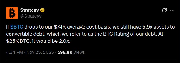 如果资产价格跌至 74,000 美元(他们的平均成本),他们持有的比特币仍然可以偿还其债务 5.9 倍。