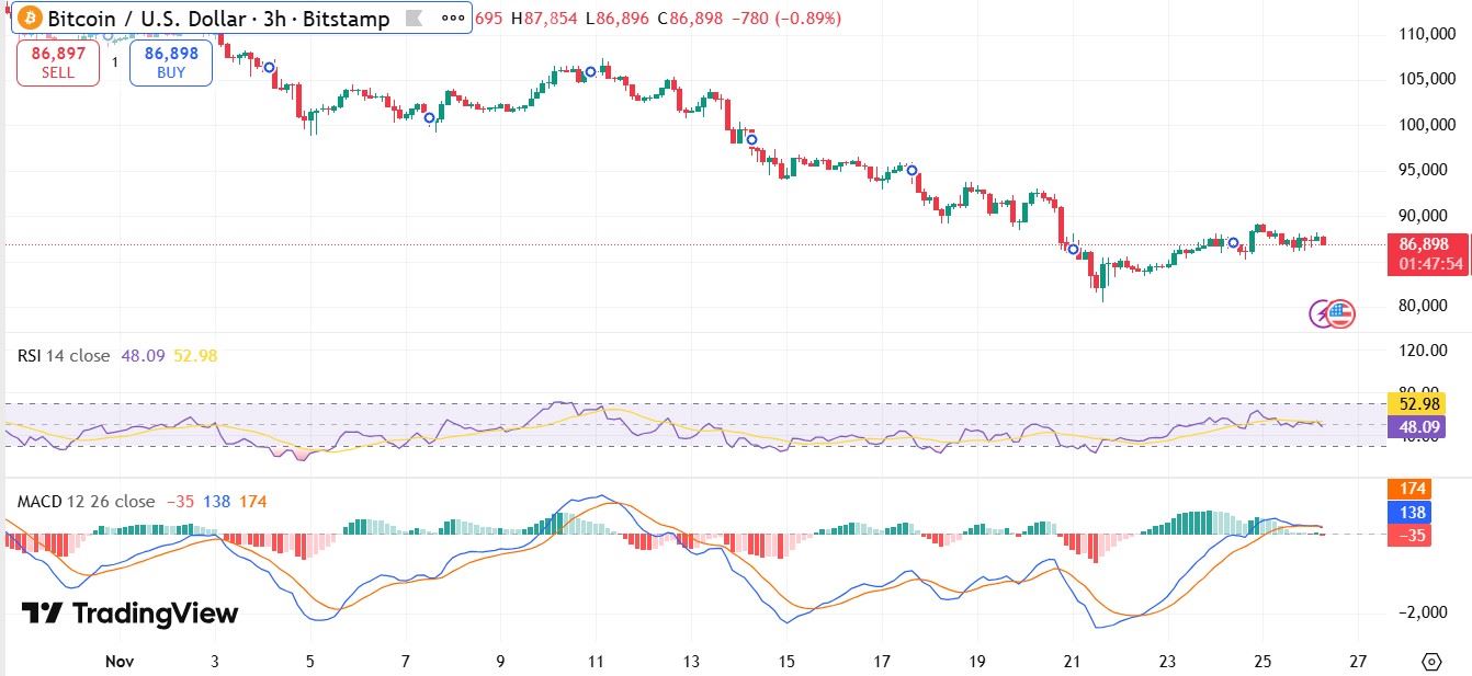 短期(未来7天):该代币价格目前可能维持在 85,000 美元至 90,000 美元之间。RSI 等指标接近 53,MACD 显示动能正在降温,正如在……中看到的那样。Tradingview图表快速上涨是有可能的,但大幅上涨需要更大的成交量。