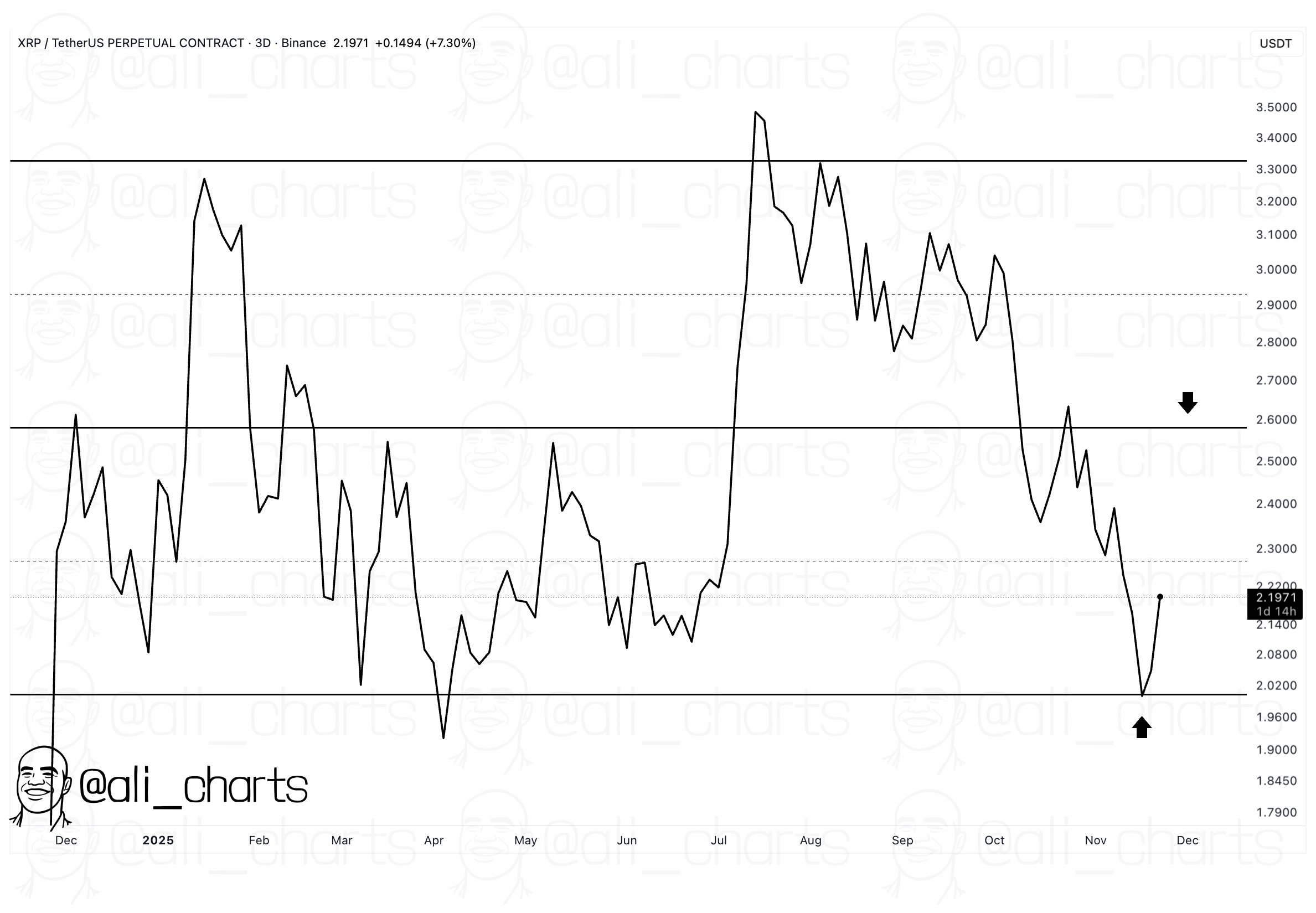 该币种随后出现反弹,这可能表明平行通道的支撑位依然有效。分析师认为,该加密货币目前可能正朝着该形态的中点——2.60美元——迈进。