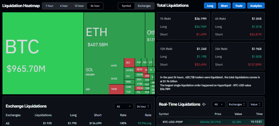 过去24小时内,共有402,738名交易者被强制平仓,总损失超过19.6亿美元。其中超过92%的仓位为多头头寸,凸显了交易者过度看涨的倾向。单笔最大金额的平仓发生在Hyperliquid平台,涉及BTC/USD交易对,价值3678万美元。