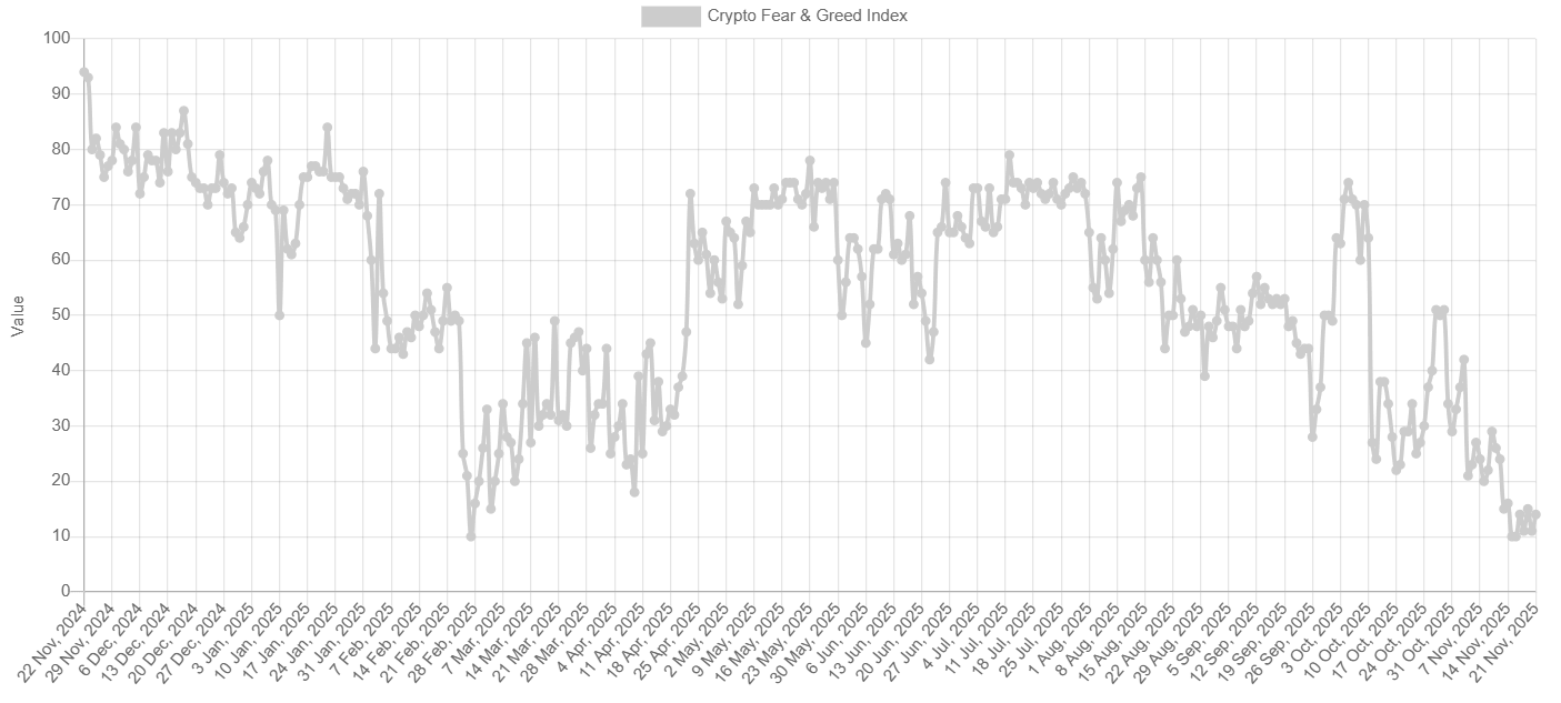 周五,恐惧与贪婪指数跌至 14,接近 2 月底的低点,表明市场参与者为进一步下跌做好准备,市场情绪急剧转向极度恐惧。