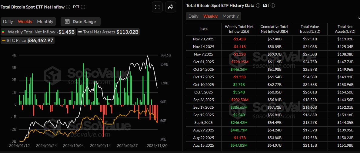 比特币 (BTC) 价格持续下跌,截至周五发稿时接近 82,000 美元,跌至七个月低点,看跌情绪在加密货币市场持续蔓延。机构需求持续疲软,现货比特币交易所交易基金 (ETF) 截至周四录得 14.5 亿美元的周流出,连续第四周出现资金流出。此外,链上状况恶化表明,交易员可能尚未看到真正的底部,因为最大的加密货币按市值计算,未来几天仍可能进一步下跌。