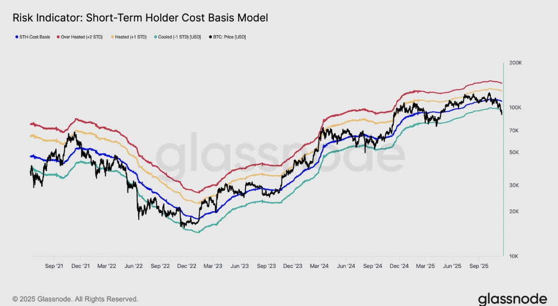 Glassnode 周三发布的周报显示,比特币市场结构发生了明显转变,跌破了 97,000 美元。随后,BTC 暴跌至 89,000 美元,创下了一个新的局部低点,低于相对于短期持有者 (STH) 成本基础的一个标准差区间 (95,400 美元),而 STH 成本基础目前接近 109,500 美元,如下图所示。