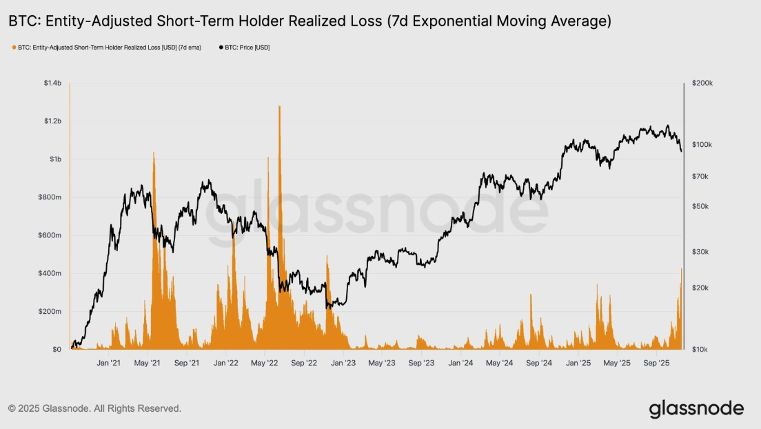 报告进一步解释说,投资者抛售潮的急剧上升进一步支撑了看跌观点。前景这是自2024年初以来比特币第三次跌破STH成本基础模型的下限,但此次的冲击规模显著更大。STH已实现损失的7日均线飙升至每日5.23亿美元,创下自FTX崩盘以来的最高纪录。