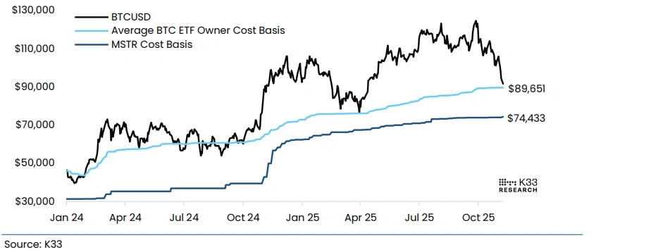 下图显示,BTC ETF持有者的平均成本价为89,651美元,比特币周二触及89,183美元的低点时曾短暂跌破这一价位,而周五的交易价格则低于该价位。在第一季度下跌期间,BTC的底部恰好位于这一ETF平均买入价位,之后开始反弹,因此如果BTC再次反弹,该价位将再次成为需要重点关注的区域。