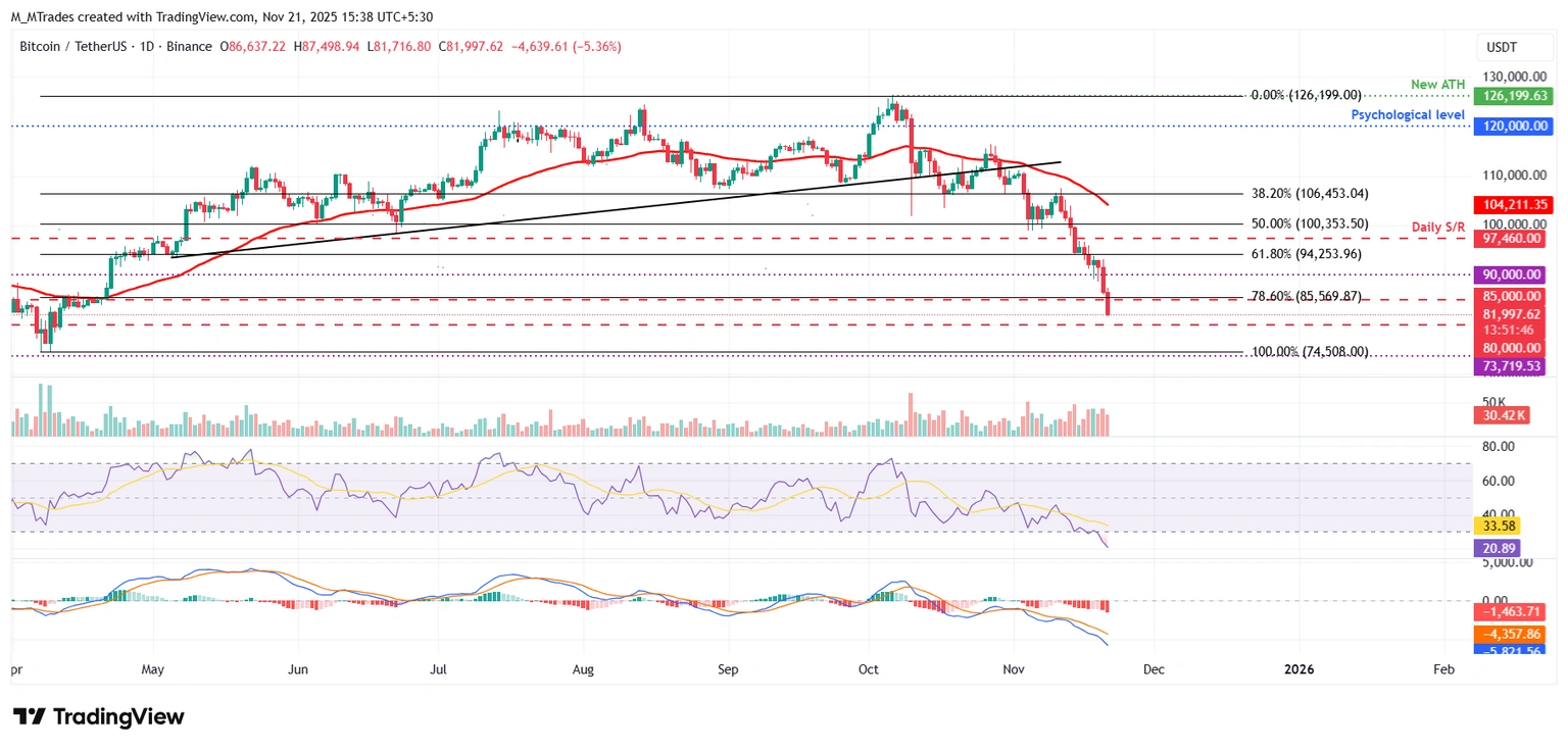 比特币周线图显示,在过去七周内,比特币价格从历史最高点 126,199 美元下跌了超过 34%,周五价格触及接近 82,000 美元的低点,并在 85,389 美元附近的 100 周指数移动平均线 (EMA) 下方交易。